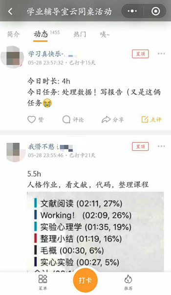 2020年5月8日至5月28日,学业辅导室云同桌活动顺利举行。疫情期间同学们独自在家学习的效率降低,为了营造更好的学习氛围,帮助同学们提高学习的效率,学业辅导室举行了为期21天的云同桌活动,为同学们提供了同伴之间互相监督和激励的平台。活动主要内容为报名参与的同学以两人小组形式进行互相监督,并在线上每日打卡学习时间。 本期活动共有74名同学(37组)参加,每日学习打卡人数均保持在60人以上,活动期间累计线上打卡1455人次。 同学们在活动中不仅每天记录自己的学习时间,同时也对自己的学习任务和完成情况进行反思和总结。有同学表示通过本次活动更加注重时间规划问题,有同学表示在活动中比以往有更大的学习动力,也有同学表示在每天的学习总结中获得了成就感。 最后,为了鼓励同学们在本次活动中的积极表现,学业辅导室根据同学们的打卡积分情况为前六名的小组提供了奖励。 至此,为期21天的学业辅导室云同桌活动圆满结束,活动为参与的同学带来了良好的参与体验,也收获了同学们的积极评价。希望同学们不仅收获21天和同桌一起学习的时光,而且收获更好的学习习惯,在以后的学业中更加进步! 来源:学业辅导室 |