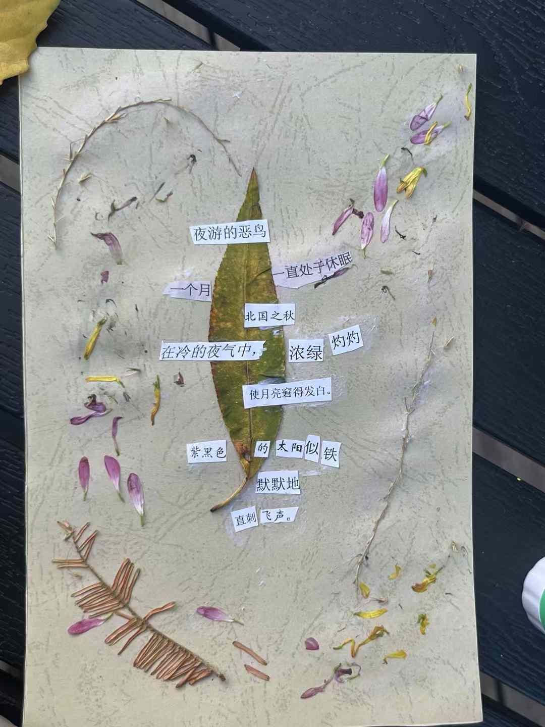 第三个活动是秋日拼贴诗:从经典文学作品《故都的秋》中汲取灵感,同学们拆解词句,构建出属于自己的诗篇。