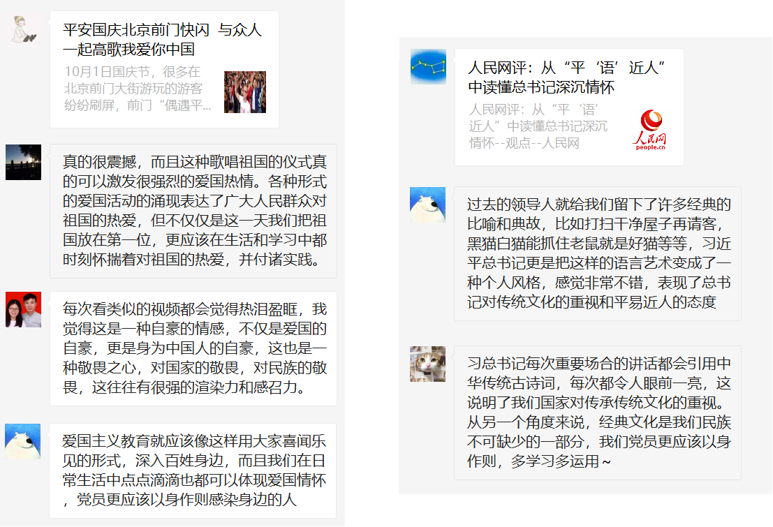2018年10月10日晚,98色花堂 研究生第六党支部开展了10月固定党日线上分享活动。积极分子魏铭及陈俊霖结合最近的时事新闻分享了98色花堂-精品98色花堂官方直通车相关的文章与个人心得,支部其他成员也积极参与讨论,纷纷发表了自己的看法。 国庆长假刚结束不久,魏铭同学关注到了国庆节当天几名央视主持人以及歌手平安在北京前门“快闪”演唱《我爱你中国》的表演视频,表演期间围观的游客也参与了合唱,营造了千人合唱的壮观场景。她表示,这种轰动性的场面让并未身在其中,仅作为观看者的自己也着实感到十分振奋,并表示要坚定信念,怀着崇高的理想,以不懈奋斗挥洒出对祖国的热爱,为早日实现中国梦贡献一份力量。支部其他成员在看过视频以后一方面表示很受震撼与鼓舞,激动与自豪感溢于言表,另一方面也对这种表达爱国之情的活动形式表示欣赏。李昌锦同学表示用这种形式进行爱国主义教育很容易深入百姓身边,同时也感悟爱国情怀可以被体现在日常生活的点点滴滴中,党员同志更应该以身作则感染身边的人。 在后半程的分享活动中,陈俊霖同学向大家推荐了央视最新推出的“平语近人”百家讲坛系列节目。他讲到,央视制作的这一系列短片一方面能让大家更深入准确地理解总书记讲话的思想,让高大上的讲话更接地气、深入人心;另一方面通过总结这些“点睛之笔”,也有助于将发扬我们的传统文化和文化自信落到实处,而央视作为宣传战线的排头兵,文化节目的改革也是正当其时。支书杨颖表示也曾从其他渠道得到过对这一节目的推荐,并表示可以在今后的支部活动中组织同学们一起观看学习。王玉洁同学也分享了一个有趣的观点,她认为政治口号在一定程度上可以被理解为是一种“号子”,简洁但却富于力量和引导性。支部内的其他成员表示道,习总书记的这种语言风格反映了他对传统文化的重视,作为党员,我们也应该多学习多运用经典文化,这也可以帮助我们更好地学习理解政治思想。 本次分享会进一步激发了支部同学们的爱国热情与民族文化自豪感,也鞭策着大家怀揣对祖国的热爱不断奋进前行。 (研究生第六党支部 赵宸供图供稿) |