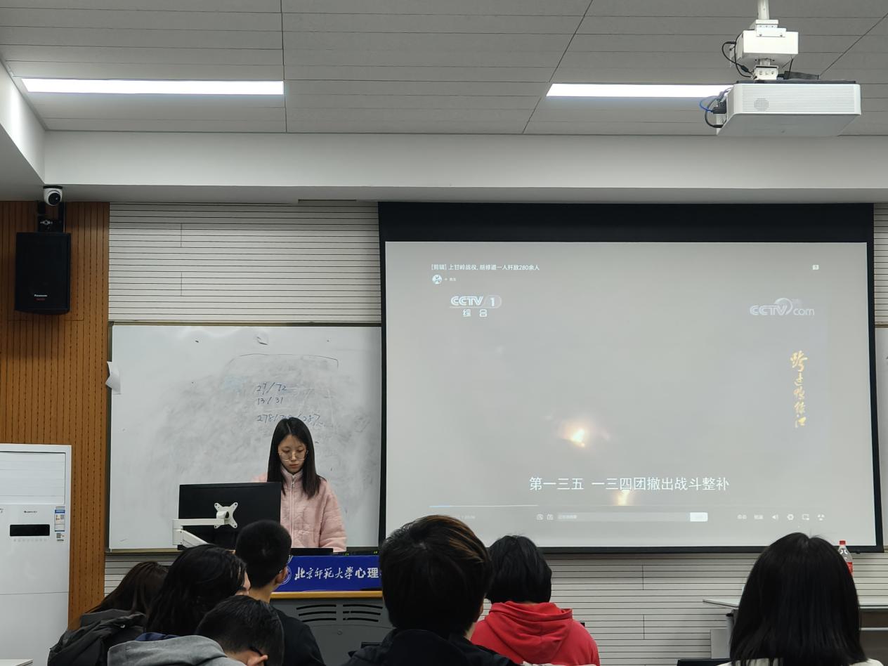 随后,我们一起观看了一段上甘岭战役的真实影像片段,切实的感受到战争的残酷。在进行了对于“是什么支撑着志愿军战士们在如此极端的环境下坚持战斗?”这一问题的思考后,我们进行了热烈的讨论。本次团日活动让同学们充分体会了抗美援朝精神的含义,明确认识到铭记历史的重要性。