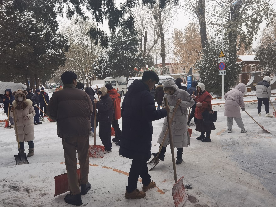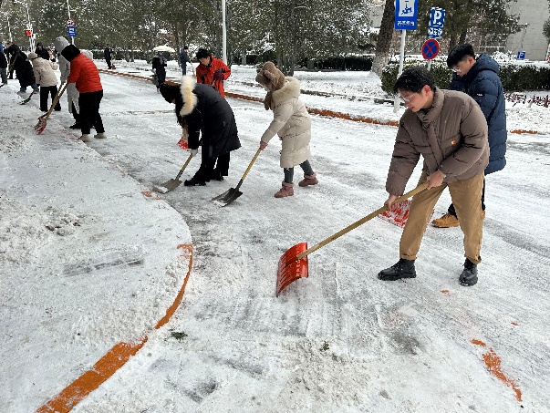 同学们从“绿园”开始,沿着环科楼到科技楼的道路,手持铁锹和推雪铲,不畏严寒,热火朝天地开展除雪工作,展现出大学生党员团结协作、不怕困难的精神风貌。