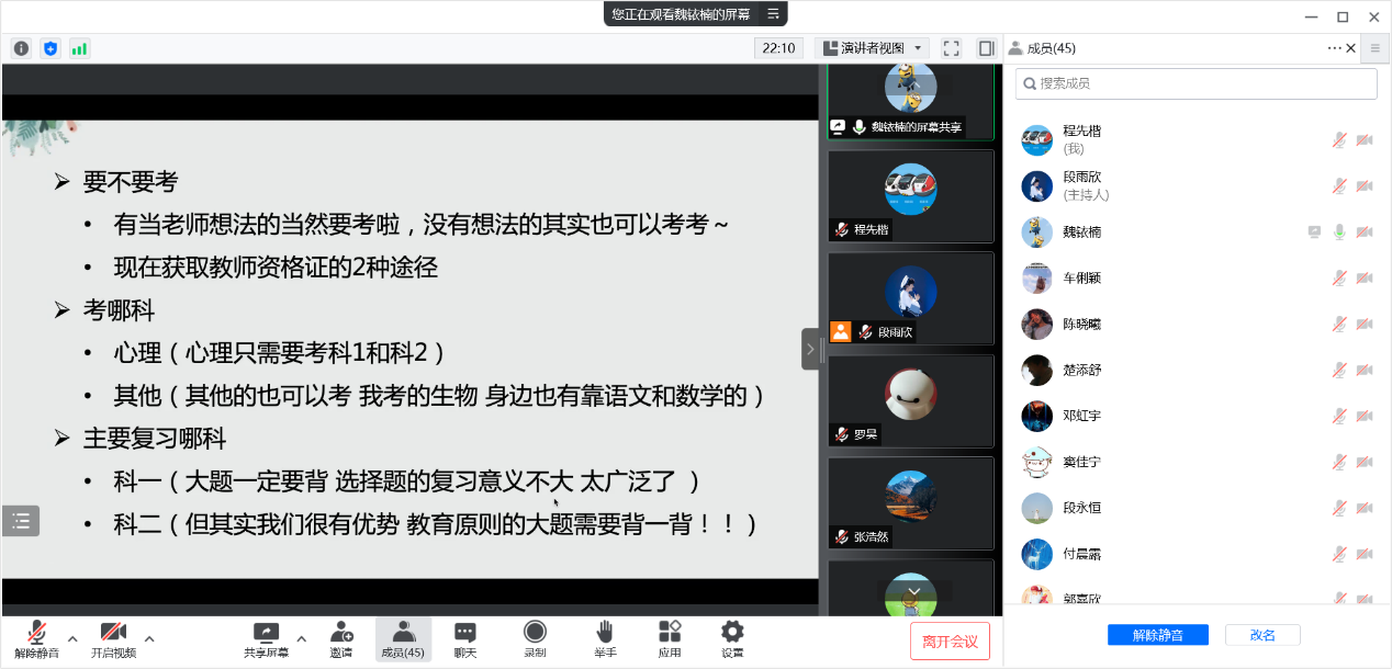 为帮助团员们更好地查找自己的不足,在将来的学习生活中取得进步,支部邀请了2019级的魏铱楠师姐,师姐从大二年级下学期考试内容和复习方式两个方面分享了宝贵经验,同时支部有许多同学有意愿参与下学期的教师资格证考试,师姐也针对此提供了准备的方法。支部借此提醒团员同学在假期也不要放松学习,认真准备延期至下学期初的期末考试,同时激励更多同学秉承师大校训,在未来投身教育事业,为祖国的基础教育事业奉献力量。
