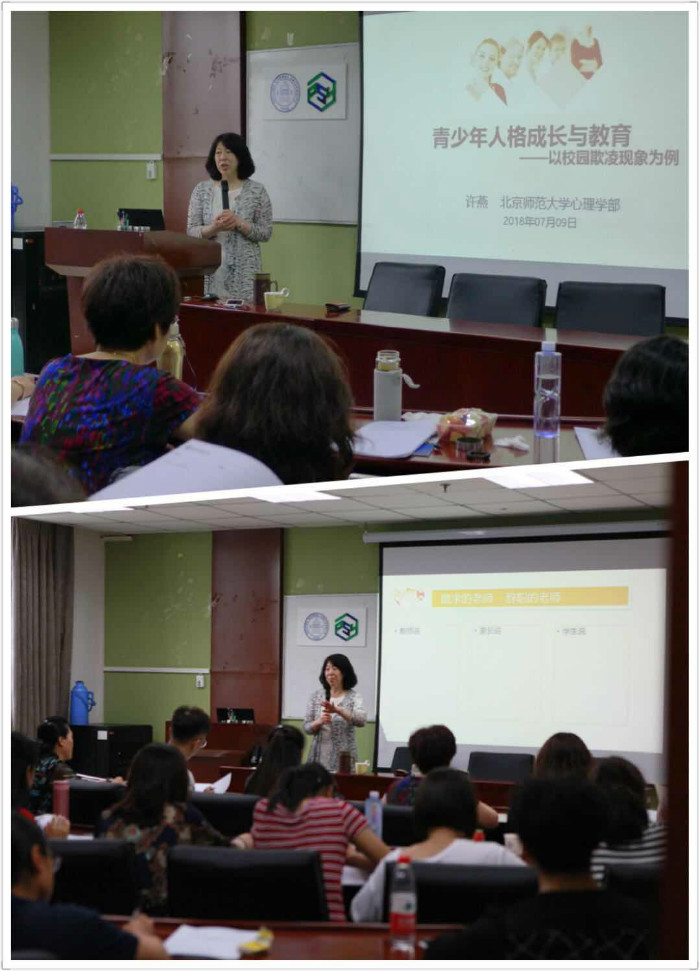 图2:刘朝莹老师为学员讲授课程 7月9日下午,许燕教授主讲的内容为”青少年人格成长与教育”,围绕当前我国儿童青少年人格发展的特点,以校园欺凌这一具有深刻现实意义的问题为出发点,通过案例分析,从乐观、韧性和希望三个方面来阐释人格成长,助力老师从以上三方面对学生进行观察、理解和指导学生的人格完善。