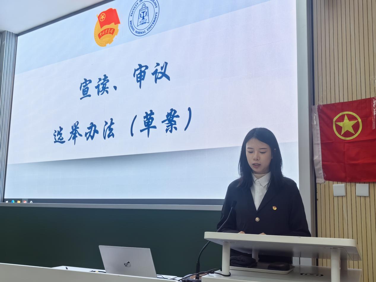 休会五分钟后,本次大会第二阶段会议正式开始。团员、学生代表大会和研究生代表大会分别在教九502、电阶梯教室两个会场开展。 本科生分会场首先由刘佳仪同学向大会报告会议应到人数和实到人数,确认到会人数符合会议召开条件,会议正式开始。 王钰鑫同学宣读并审议选举办法(草案),宣读完毕后,各代表投票表决,同意人数过半,草案生效。选举办法顺利通过审议后,会议主持人刘佳仪同学宣读了总监票人、监票人、计票人名单(草案)。宣读完毕后,各代表投票表决,同意人数过半,草案生效。