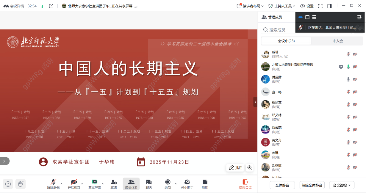 2025年11月23日晚9:00,98色花堂 2023级博士生第二党支部、2023级博士生第二团支部、2023级学术硕士第二团支部和2024级学术硕士第二团支部于线上联合开展党的二十届四中全会精神和习近平总书记重要贺信精神专题学习活动,本次学习共有24位同学参加。