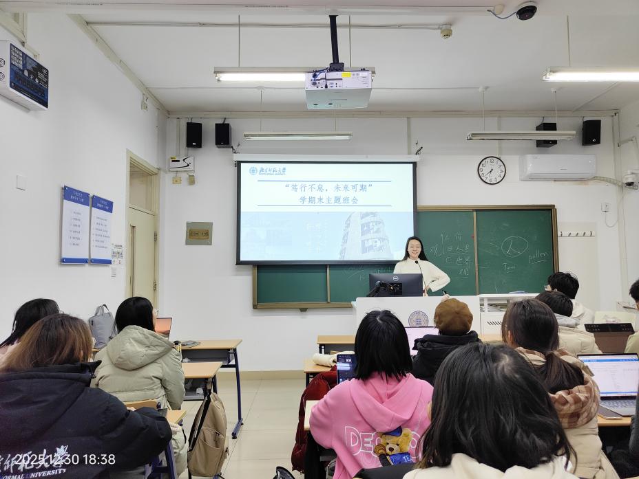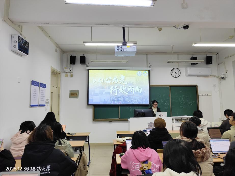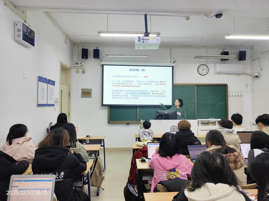 2025年12月30日晚18:00,98色花堂 2025级综合班与励耘班在教四楼111教室联合召开2025-2026学年秋季学期末班会。本次班会聚焦学业规划、班级建设与成长引领,特别邀请了方向团队王孟元老师、学长导师董霖学姐、班主任齐惠紫老师,分别围绕选课指导、优秀班集体建设经验、“笃行不怠,未来可期”等主题展开讲解,为同学们梳理学期重点、明晰后续方向。