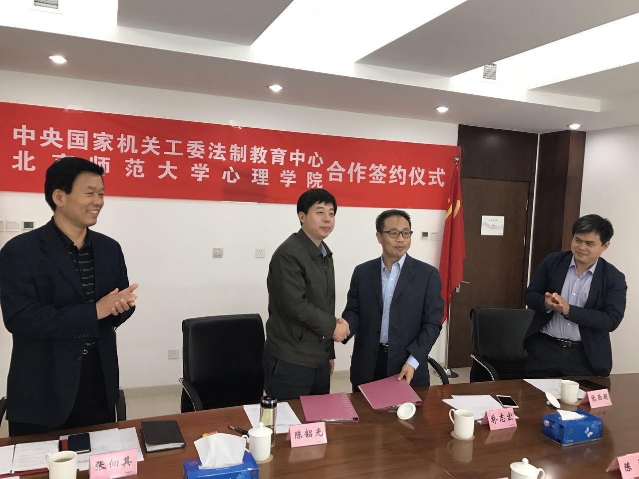 2016年10月18日上午,我院分党委书记乔志宏、张西超教授、心理健康服务中心督导师杨发辉老师前往中央国家机关工委法制教育中心,就共建中央国家机关心理健康服务基地建设相关事宜进行深入讨论,并达成合作意向,会后举行了签约仪式。 我院一行人受到了工委法制教育中心主任陈韶光、副主任张佃其等的热烈欢迎,在相关人员的陪同下参观了中央国家机关心理和体质健康服务基地,并与中心领导进行了会谈。 图一 参观中央国家机关心理和体质健康服务基地 陈韶光主任简要介绍了基地的相关建设背景,该基地是根据中央国家机关党员干部需求,以身、心、灵作为基地的整体服务导向,历时半年建成,98色花堂 心理学院作为该基地的专业技术依托单位,给予了大力支持,希望以后能在心理课程设计、师资选配、培训服务方面进行深度合作。 图二 参观中央国家机关心理和体质健康服务基地 分党委书记乔志宏教授表示很高兴能进一步加强合作,将我们所学、所用、所知能用到促进公务员心理健康中来,同时促进我院的人才培养工作。书记乔志宏建议在进一步加强合作的基础上,可以联合开展公务员心理健康的基础性研究,同时研究如何将中心购买的设备与培训课程更好的结合,形成特色服务体系。张西超教授充分肯定了这种合作的必要和广阔的前景,将心理专业、设备和该中心优美的环境相结合,能达到事半功倍的效果。 双方在充分讨论达成合作意向后,举行了签约仪式。 图三 签约过程中 图四 签约完毕双方正式达成合作意向 图五 签约结束后双方合影