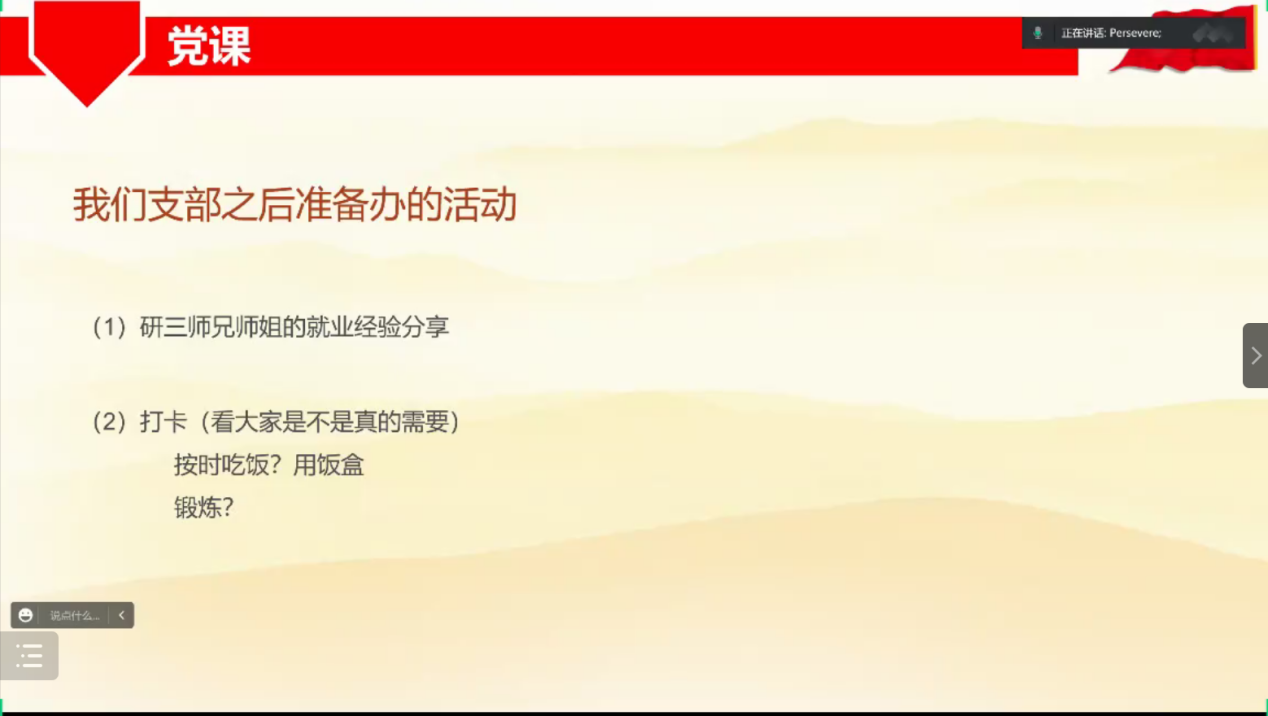 同志们也就支书赵恒的讲述内容进行了激烈的讨论,从政策的施行等角度表达了自己的观点与看法。同志们都认为虽然“动态清零”政策在一定程度上造成了不便,但总体来看,其还是保护了人民的利益,最大可能性地防止人民感染病毒。 同志们也就近期校园内事件以及“教材插图”事件进行了激烈的讨论:虽然身处安逸的环境,但身为共产党员,也要警惕认知战,在庞大的信息流中保持理智清醒的头脑,有鉴别性地接受信息。 最后,党支书赵恒也征集了支部内成员对于支部未来活动的建议,如就业分享活动、打卡活动等,大家都积极地贡献自己的力量,为支部未来建设提供自己的建议。