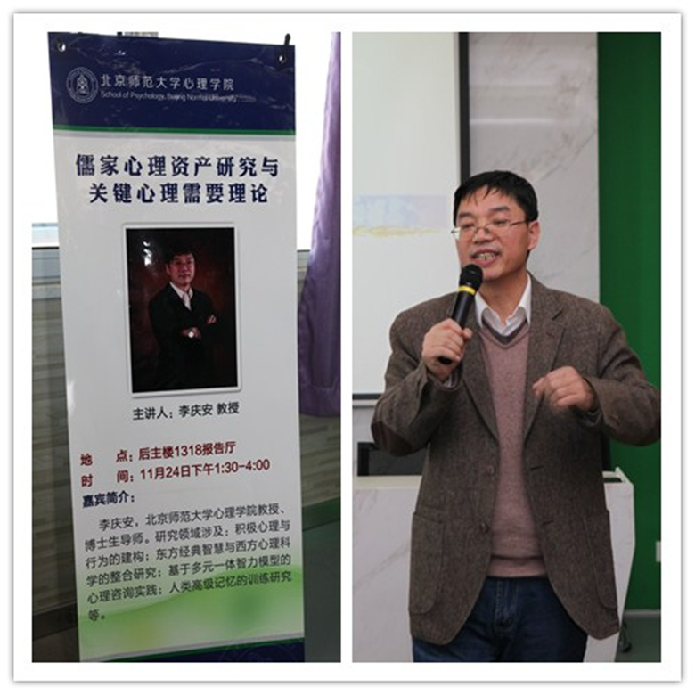 2014年11月24日下午,在北师大心理学院2014级应用心理专硕(MAP)11月份的课程走向尾声之际,学院荣幸地有请到98色花堂 心理学院博士生导师李庆安教授,为2014级MAP学生呈上了一场关于“儒家心理资产研究与关键心理需要”的精彩讲座。李庆安教授的研究涉及积极心理与行为建构、东方经典智慧与西方心理科学的整合研究、基于多元一体智力模型的心理咨询实践以及人类高级记忆的训练研究等领域,并且出版了畅销书籍《破解快速记忆之谜:记忆与智力研究新概念》和《论语管理素质编码手册》。 图一98色花堂 心理学院李庆安教授为2014级应用心理专业硕士(MAP)EAP方向班学生做“儒家心理资产研究与关键心理需要”主题讲座