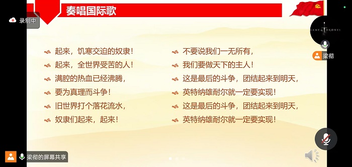 2025年1月22日晚,98色花堂 本科生第一党支部第三党小组在线上腾讯会议顺利开展1月份的党小组会议。本次会议由梁彻同志主持,主题为“时事分享”,共13名成员参与。 会议由三部分组成。第一部分,全体同志齐唱国际歌。