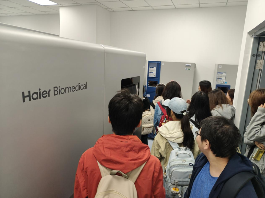 接着,我们前往参观样品制备与模式动物中心。样品制备与模式动物中心是为生物医学成像科学研究和设备研发过程中所涉及的动物实验验证和致病机理研究提供实验动物饲养、实验动物疾病模型制作、分子生物实验、研发仪器配套器件的研发和改造、样品保存等全方位的技术支持和保障。 图为组织样本库,配备有-80℃冰箱室、液氮生物样本库 平台同时还配备有手术室、动物实验室、影像室、代谢实验室等,可提供疾病模型制备、动物疾病表型分析等技术服务。 第三站是医学成像楼。此处配备的多模态医学成像装置旨在对完整生命体的组织器官进行结构和功能成像,在体研究大脑认知和重大疾病(肿瘤、心脑血管等)的多参数的时空关联性。在这里,我们参观并了解了新一代高灵敏脑磁图成像系统、人体7T磁共振成像仪器等“大国重器”,并学习了相关设施运行原理及基本的成像诊断方法。 最后,我们来到细胞成像楼。多模态活体细胞成像装置聚焦于以高时空分辨率成像方式记录生理状态下活体内的精细生命活动。此装置包括活体细胞组织高分辨成像、细胞高时空分辨成像、介观-微观多模态成像等多个子系统。 至此,怀柔脑科学大设施参观圆满结束。 此次 2024 级励耘班团支部参观北京大学国家生物医学成像科学中心的团日活动圆满结束。大家在领略“国之重器”风采、解锁脑科学知识的过程中,收获满满,既拓宽了科学视野,又激发了探索热情。作为新时代青年,我们定会将这份对科学的敬畏与追求转化为学习动力,努力提升自我,为科技发展贡献力量,不负青春韶华!