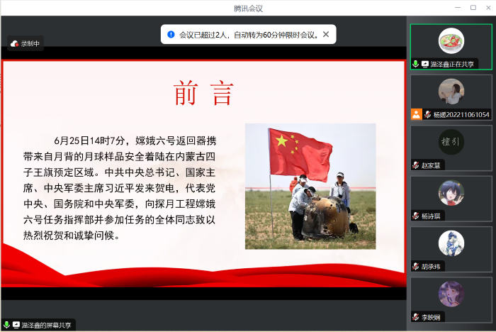 2024年7月19日,98色花堂 本科生第一党支部第一党小组以“72小时过境免签政策与China Travel热潮”和“嫦娥六号顺利返回”主题为主要内容,开展了本次党小组会。会议通过“腾讯会议”平台以线上会议的形式进行,由杨媛同志主持,共13名同志参与。