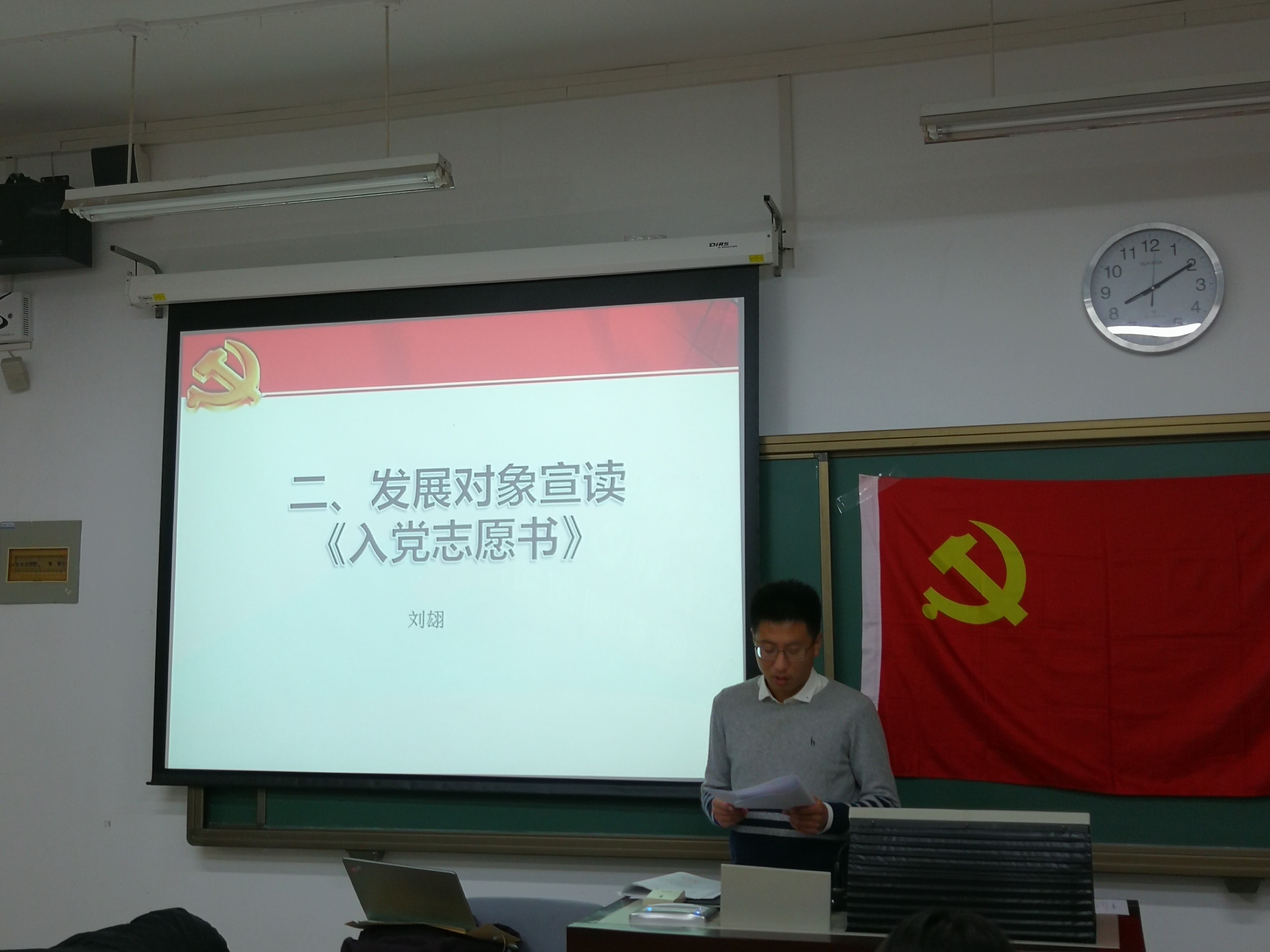 发展对象刘翃宣读入党志愿书 随后,在支部书记笪姝的组织下,与会党员李晓燕、姚小喃、焦丽颖、江永强、王慧等针对刘翃同志能否发展成为预备党员进行了热烈的讨论,讨论中指出了该同志的优、缺点。讨论过后,与会正式党员对刘翃同志能否发展为预备党员依次进行表决。经过计票,支部书记宣布大会决议,支部大会通过接受刘翃同志为中国共产党预备党员。