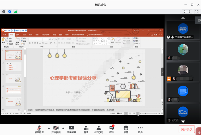 2020年6月14日下午两点,学业辅导室线上考研经验分享会如期举行。本次活动邀请到了刘晨淼、王瑞冰、汪悦、王子仪、杜汇杰、廖祎、甘霖和陈靖州八位同学,八位嘉宾结合自己的经历,分享了不同学校和不同方向的备考内容,并在线解答了同学们在考研准备过程中遇到的问题,令参与活动的同学受益匪浅。 首先,刘晨淼根据自己的经验给同学们建议了专业课和英语三轮复习的规划,向同学们介绍并分享了专业课、英语和政治的参考资料。报考中国人民大学心理系的王瑞冰同学为大家分享了自己初试经验,强调政治复习中背真题的重要性,英语复习时间和重点因人而异。紧接着,汪悦同学为大家分享了自己在备考过程中的时间安排以及政治、英语和专业课的所用资料,并且根据自己经验总结出了几点建议,分享了自己的考研心得。王子仪同学提示同学们关注目标院校往年的考研信息很重要,同时还为同学们分析了今年考试的特殊性。之后王子仪同学分享了自己考研方向的备考书目和个人时间进程,并从作息和心态等方面提供了初试备考建议。 随后,报考专硕的四位同学进行分享。杜汇杰同学报考方向为外校应用心理学专硕,他介绍了该校应用心理学专硕的基本情况,并且结合网上他人经验和个人备考经验向同学们做了分享。廖祎报考的是本校教育学方向专硕,在分享过程中廖祎主要介绍了跨专业的专业课科目以及自己的备考安排。甘霖同学重点分享了自己在复习和考试中的心态。最后,陈靖州同学向大家介绍了在专业选择上需要考虑的方面以及如何获取信息。并且分享了自己的作息时间和复习安排,提醒同学们在几个重要时间节点需要做好心态调整。 嘉宾分享环节结束后,同学们和嘉宾们交流了在考研准备过程中遇到的其他问题。本次考研经验分享会在同学们对嘉宾的留言致谢中圆满结束。 来源:学业辅导室 |