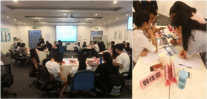 此次参访的活动安排充分体现了深度体验、专业学习特色,设置了体验式测评和智联介绍两个环节。体验式测评以“地王争霸”为主题,采取游戏的形式。参访同学们在随机分组后,各组成员共同商讨并确定各组组名及盈利目标,游戏循环五轮,盈利最多的小组获胜。在主持人的引导下,各组派代表分享了参与游戏的体会与启发,及其对游戏考察维度的思考。