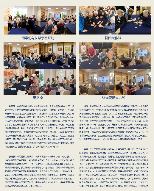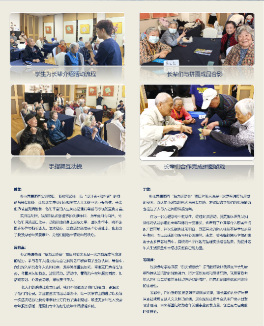 回忆录项目和脑力运动会项目同学们制作的心得体会展板 时光纪年回忆录项目,以叙事疗法为理论基础,通过深度访谈,记录泰康燕园长辈的人生故事,并将其整理、制作成的个性化的长辈回忆录。在此项目中,23 位本科生成功记录了 11 位长辈的人生故事。同学们两人一组,与11位长辈进行配对,每组针对一位长辈开展4次深度访谈,每组访谈总时长近8小时,确保对长辈人生故事进行全面、细致的挖掘。项目由23位本科生参与,成功记录了11位长辈的人生故事,收集了长辈提供的166张珍贵照片,最终形成的回忆录总字数达67848字。