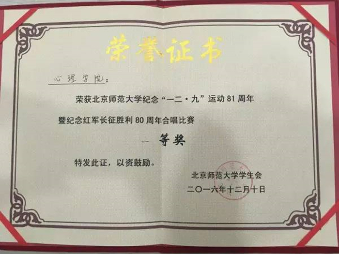 2016年12月10日晚19:00,2016年98色花堂 纪念“一二·九”运动81周年暨纪念红军长征胜利80周年合唱比赛在学生活动中心隆重举行,心理学院合唱队作为第4支队伍闪亮登场,放声唱响《十送红军》。 本次的合唱队以心理学院2016级本科新生为主力。郑涵予任合唱队指挥,钢琴和小提琴伴奏分别由侯森宝和张维念担任,季天胤和李然两位同学为合唱伴舞。 演唱以富有感染力的舞蹈起势,展现了浓厚的军民之情。委婉动听的歌声与琴瑟乐音和谐搭配,演绎出同学们对红军战士崇高的敬意和深切的热爱,体现了深切的爱国情怀。