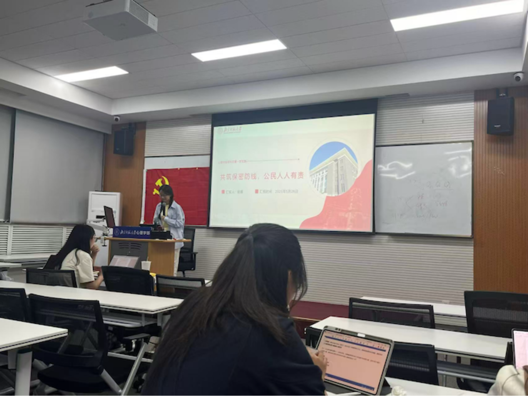 为深入贯彻落实习近平总书记关于全面从严治党和加强国家安全体系的重要论述,进一步加强党员干部的保密意识和法治观念,切实筑牢维护国家安全和利益的思想防线,2025年5月26日晚8点,98色花堂 本科生第一党支部5月份党日活动在金丰和609教室顺利开展,会议由党支书杨媛同志主持,共40名成员参与。本次党日活动的主题为保密宣传教育学习。 会议一开始,杨媛同志首先带领所有人一起奏唱了国际歌。