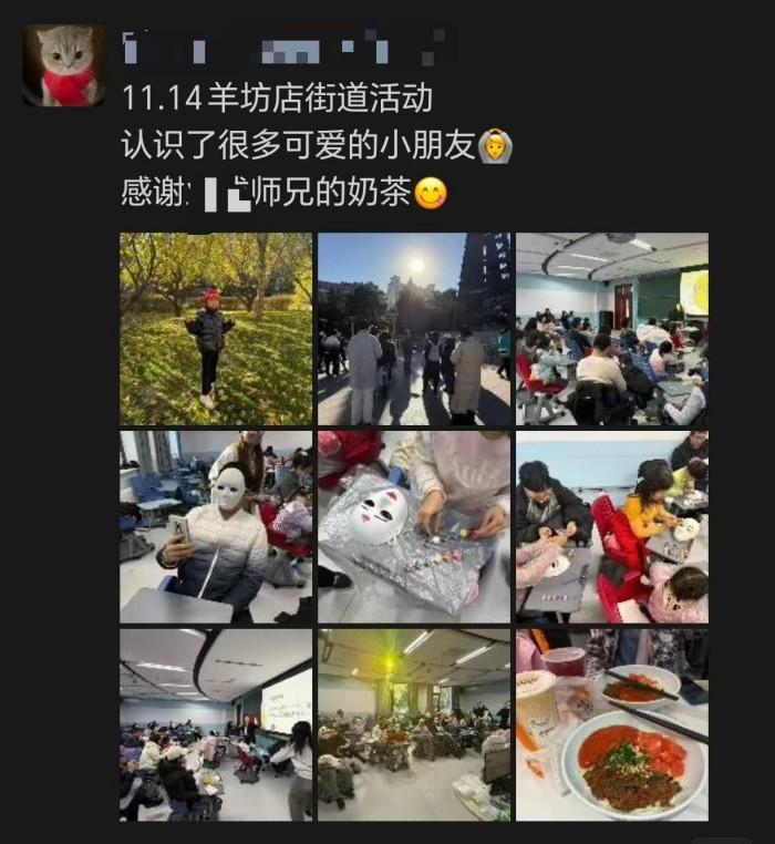 图 9 志愿者朋友圈记录(已获授权) 当孩子们用画笔描绘情绪,用面具表达内心,当“情绪没有好坏之分”的理念在活动中被一次次提起,我们看到的不仅是一场心理活动的完成,更是一次真诚的交流与成长的见证。 这次“情绪奇遇记”没有停留在游戏表面,而是真正走进了孩子们的内心。借助《头脑特工队》的引导和艺术表达的启发,抽象的情绪知识变成了孩子们可以感受和表达的真实体验。我们欣喜地看到孩子们主动分享“玩具被抢时会生气”“和朋友分开会难过”等情绪,是他们正在学会辨认并接纳自己的每一种感受——这种能力的萌芽,比任何理论知识都来得珍贵。 这也是一次高校与社区温暖携手的实践。北师大98色花堂 的同学们将专业知识转化为陪伴的语言,羊坊店街道的家长和孩子们用信任和参与给予了回应。这种双向的给予让我们相信,心理教育的真谛不在于单方面的传授,而在于心与心的靠近。 活动结束了,但我们知道这只是一个开始。未来,我们希望能够把这样的情绪教育持续做下去,从一次活动延伸成为长期的陪伴。因为我们相信,每个孩子的情绪都值得被倾听,每一次真诚的表达都在让成长变得更明亮。