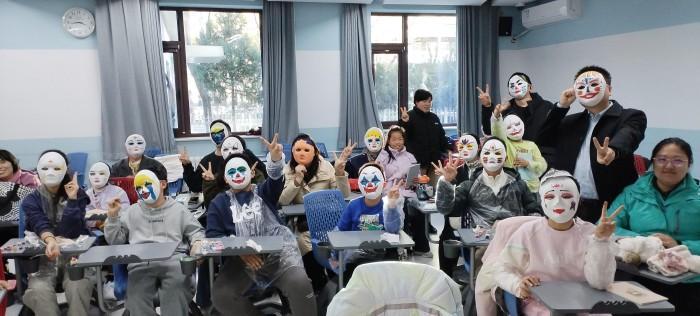 图 6 家长与孩子带着自己亲手绘制的面具合影