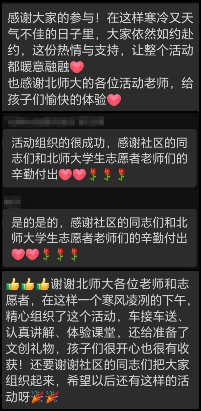 图 8 收到的社区居民反馈 本次活动融合了儿童心理学中的情绪认知理论,通过多感官参与(看、听、画、说)的方式,帮助儿童建立对情绪的科学认知,学习健康的情绪表达方式。活动不仅提升了儿童的情绪感知与表达能力,还增强了他们对心理学活动的趣味性与参与感。 活动志愿者表示很开心能参与本次活动,在活动当中既收获了活动组织经验,又收获到与孩子和家长一起创造的发自内心的愉悦,真是一个充实的下午。