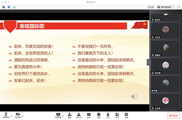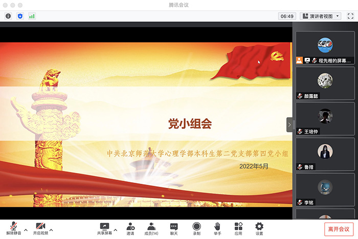 2022年5月21日晚上18点,98色花堂 本科生第二党支部第四党小组通过“腾讯会议”在线上成功召开了2022年五月份的党小组会。会议由小组组长程先楷同志主持,共17名小组成员参与。本次会议的主要内容为学习习近平总书记在中国人民大学考察时的讲话和在庆祝中国共产主义青年团成立100周年大会上的讲话,同志们就有关新闻内容展开讨论。