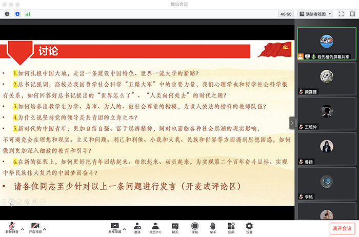 最后,程先楷同志鼓励各位同志围绕刚才学习的讲话内容对以上问题进行讨论,发表学习体会。同志们在聊天区踊跃发言:郑藕杏同志从精神建设、博物馆建设、师资建设、数字化建设四个方面分析如何“走出一条建设中国特色、世界一流大学的新路”;马新超同志提议应该从教师的考评制度方面着手,通过提高待遇和完善绩效指标来“培养出教学生为学、为事、为人的、被社会尊重的楷模,为世人效法的榜样的教师队伍”;李铭同志认为“坚持党的领导是共青团的立身之本”的原因是中国共产党让共青团理清楚“往哪走”,“干什么”,和 “怎么干”的问题……在同志们的讨论中,本次会议圆满结束。
