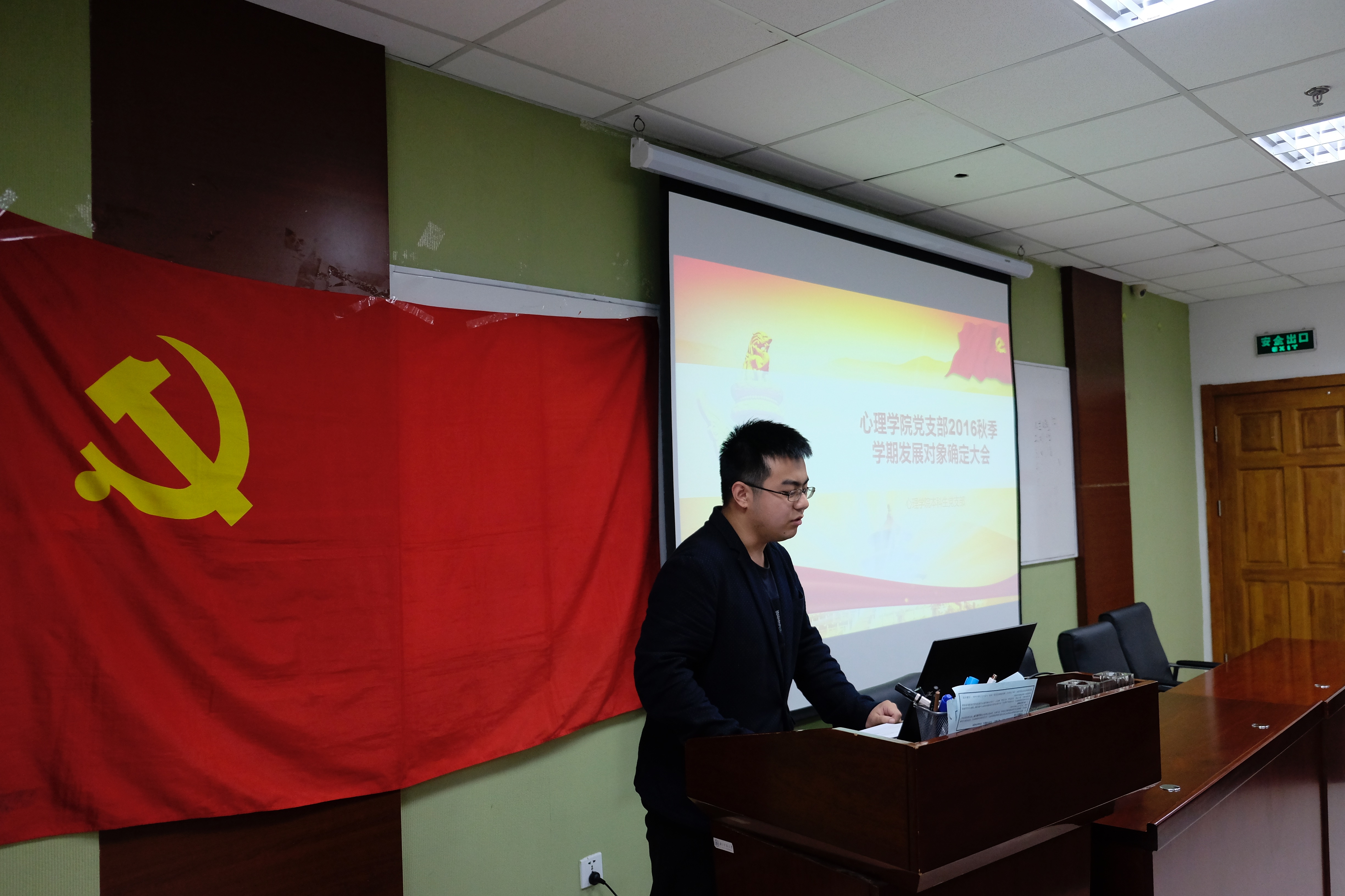 2016年10月21日下午,心理学院于后主楼1420召开了本学期的确定发展对象大会。本次大会由心理学院本科生党支部承办,由本科生党支部书记尹冲主持。分党委副书记王瑞敏、分团委书记史佳鑫、党务秘书曹昌健、学生工作办公室老师张照鹏及本科生、研究生党支部的支委出席了大会并担任评委,本科、硕士党支部部分积极分子列席学习。 首先,尹冲介绍了积极分子候选人的总体情况,说明了评选规则和评选流程。随后,王景民等25位候选人就思想、政治、学习、工作和生活等方面情况进行了个人陈述,阐述了自己对党的认识、入党动机、未来努力的方向等。王瑞敏老师为各位候选人提出建议,指出入党是一种信仰,发展对象必须达到真正的政治认同,提醒候选人把自己对党的理论的理解和个人的实际行动有机地结合起来。个人陈述与问答结束后,各位党员同志依据评分标准、结合陈述内容及平常表现对候选人进行了评价。