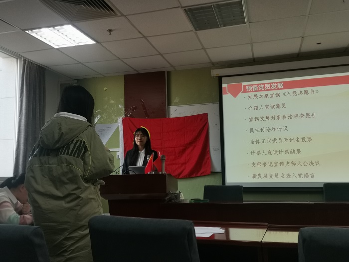 全体到场人员合唱《国际歌》后,主持人对本次大会的流程及发展对象顺序进行介绍。随后,刘一诺、陈雪岩、陈璐3位同志分别宣读了入党志愿书,并由第一介绍人宣读介绍人意见。之后,与会同志对发展对象的生活、学习、工作等情况进行了民主评议。最后全体正式党员进行了无记名投票。