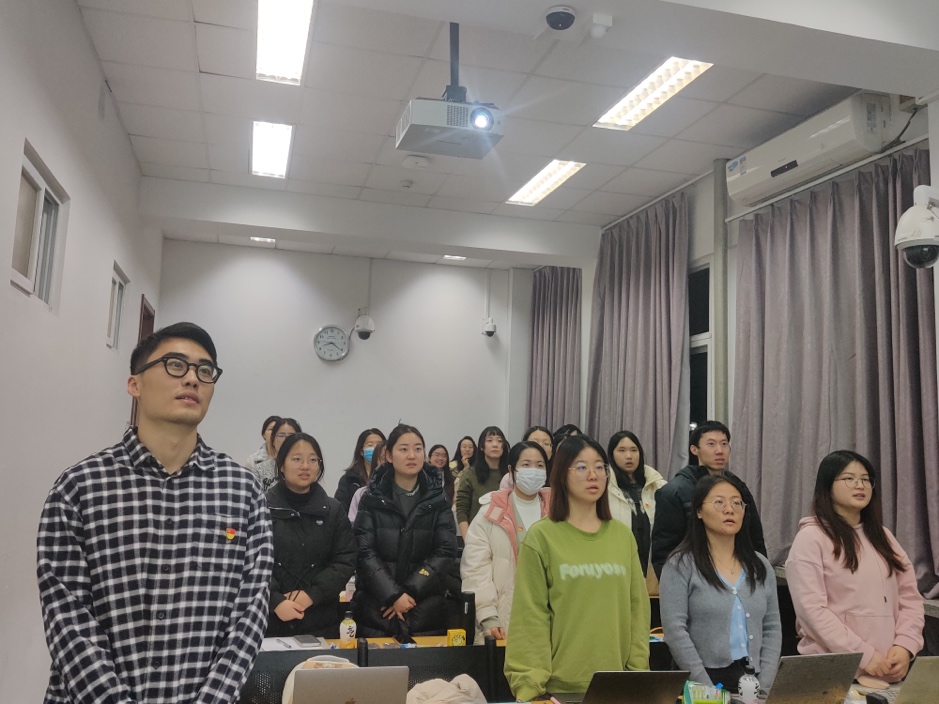 2024年12月20日20时30分,2024级博士生第二党支部在电子楼103召开了2024-2025学年秋季学期预备党员转正大会。会议由党支部书记郑远同志主持,共15位党员及2位预备党员参加,2位党员给予书面意见。本次会议的主要内容为讨论李骁轩和许孟翟两位同志的转正申请。 会议开始,全体成员起立,合唱《国际歌》。随后,党支部书记郑远同志介绍本次预备党员转正大会流程。