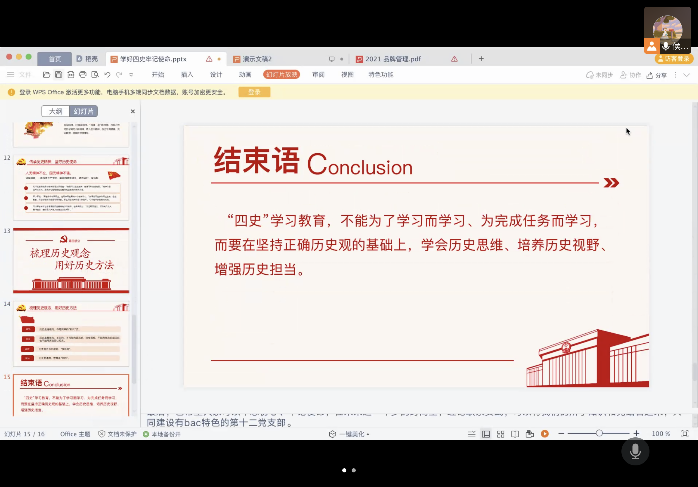 2021年2月28日晚19:00,98色花堂 研究生第十二党支部于腾讯会议开展了本年度第一次支部主题党会。会议由支部书记侯雅莉同志主持。 本次主题党会的会议主题是:学好“四史”,牢记初心使命。四史对于党员来说,具有重要的意义。学好党史、新中国史、改革开放史、社会主义发展史,要从历史知识、历史经验、历史精神、历史方法这四个方面入手,依次递进,掌握重点,把握方法。 (一)学好历史知识,形成历史认知 (二)吸取历史经验,把握历史大势 (三)传承历史精神,坚守历史使命 (四)梳理历史观念,用好历史方法 在侯雅莉同志依次讲解完“四史”的四个方面后,与会同学根据自己的理解,发表了自己的看法,进行了交流。“四史”学习既是必修课,也是一项要长期进行下去的学习。我们要不断在“四史”学习中学会历史思维,培养历史视野,增强历史担当。