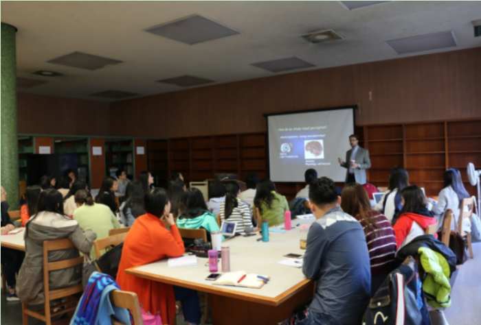2016年11月29日上午,心理学院为期两周的2016MAP美国实践行项目拉开了序幕。本次实践行由经筛选选拔的27位北师大心理学院应用心理专业硕士(MAP)在读学生组成,有心理学院分团委书记史佳鑫老师带队,行程历时两周。 图1北师大心理学院2016MAP美国实践行正式启程 第一课,MAP同学们来到了美国加州伯克利大学教育学院,在原儿童图书室(the old children’s literature room)聆听了Prof. David Whitney的《perception》。老师讲述了如何通过研究视觉来研究大脑,并通过经典实验和同学们的真实体验让大家学习了研究视觉的方法、视觉的一些基本结果,以及他们实验室的最新研究方向和进展。收获满满的同学们纷纷感慨“不能轻易相信自己的眼睛了”。 图2北师大心理学院2016MAP美国实践行成员在美国加州伯克利大学学习 课程结束后,同学们积极与老师互动,探索了关于研究的具体细节问题。我们也向老师赠送了师大的礼物,并邀请老师来师大心理学院共同学习。