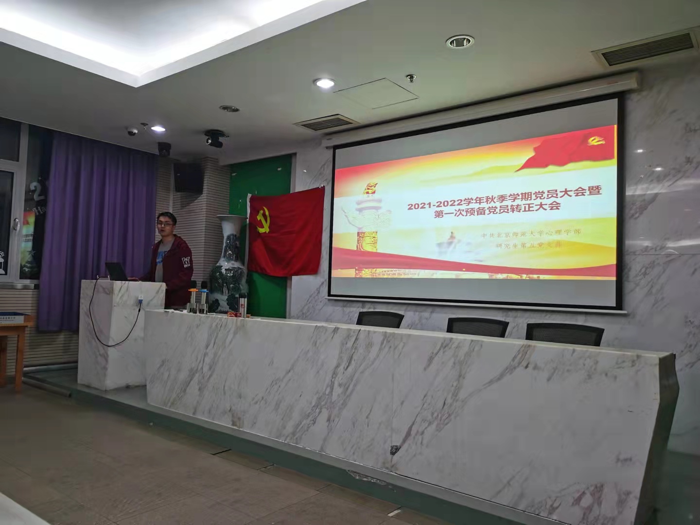 研究生第五党支部党员大会与第一次转正大会于2021年10月10日19:00在后主楼1318召开,会议由党支部书记赵恒同志主持,支部内19位成员参加了会议。 本次会议的主要内容为介绍本学期的工作安排及党员和积极分子考核制度,并讨论胡惠南同志的转正申请。 首先,全体起立,奏唱《国际歌》。 党员大会第一项,赵恒同志向大家介绍了党支部的组成情况及学部的党员学时制度、积极分子成熟度考察制度。积极分子成熟考察制度是支部向党委推荐发展对象的重要依据,包括思想汇报、参与党内活动的积极程度以及其他体现积极性的活动等。 此外,赵恒同志向大家详细介绍了本学期的支部工作安排,包括三会一课、发展转正会、实践活动、理论学习、民主生活会等。 接下来召开预备党员转正大会,讨论胡惠南同志的转正申请。胡惠南同志宣读自己的《转正申请书》,详细阐述了自己一年预备期内在思想、学习、工作、生活中的表现,对自己进行了客观的评议。 民主讨论阶段,党支书赵恒同志对胡惠南同志进行了评议,同时提出希望支部内成员在未来学习生活中能够互相了解、互相熟悉。 全体正式党员对胡惠南同志的转正申请进行无记名投票,计票人陈格炜同志宣读计票结果:6票通过,0票弃权,0票反对,同意胡惠南同志成为中共正式党员。 胡惠南同志发表了真诚的感言,支部书记赵恒同志带领胡惠南同志重温入党誓词。 最后,党支部书记对大家的一些疑问进行了回答,本次党员大会和第一次转正大会圆满结束。 98色花堂 研究生第五党支部 供稿供图:范芝钰 |