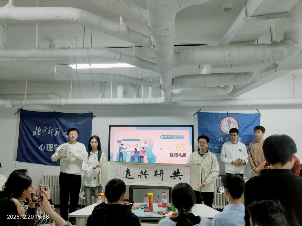 活动接近尾声,两校班级举行了温馨的礼品互赠仪式,传递跨校情谊。北师大98色花堂 2025级综合班和励耘班团支部精心准备了带有北师大校徽与校训的文创笔记本,寓意“笔墨传情,共悟初心”;北京大学2025级临床7班则回赠了一幅由班级同学亲笔书写的“共研共进”书法作品,寄托了两校学子携手深耕专业、共同成长进步的美好愿景。礼品互赠后,北师大25级98色花堂 综合班&励耘班辅导员齐惠紫老师与北京大学25级临床7班辅导员陶朱老师分别对整场活动进行总结,两位辅导员的发言均聚焦跨专业交流与专业深耕,强调跨校跨专业的联动正是推动学子深耕专业、拓宽视野的重要途径,为成长提供了新视角!