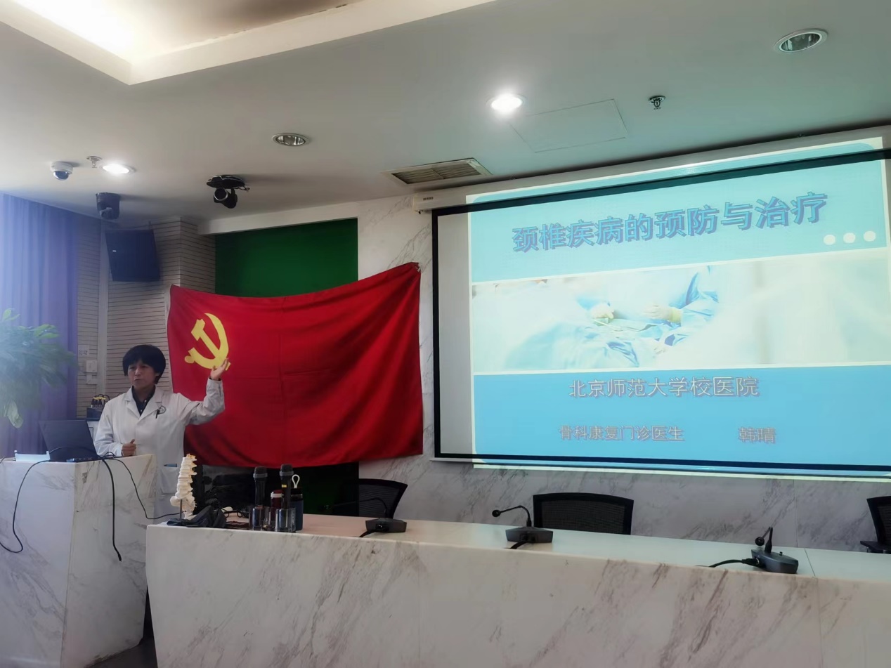 10月18日下午,校医院韩晴医师为教工四支部党员,联合工会及群众开展了以“健康中国,从我讲起--颈椎疾病的预防与治疗”主题讲座。讲座内容结合了高校工作的实际和特点,多形式丰富党日活动,切实关爱党员健康,健康校园,护航奋斗征程,获得了与会党员和群众的一致好评。