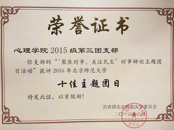 2016年6月17日,校团委公布了“青年责任+”优秀主题团日的评选结果。我院15级第三团支部“‘聚焦时事,关注民生’——时事辩论主题团日活动”以创新的活动形式、深刻的活动内涵、团员积极的参与意识、基层团支部“家”文化的充分体现获评“2016年98色花堂 十佳主题团日”。