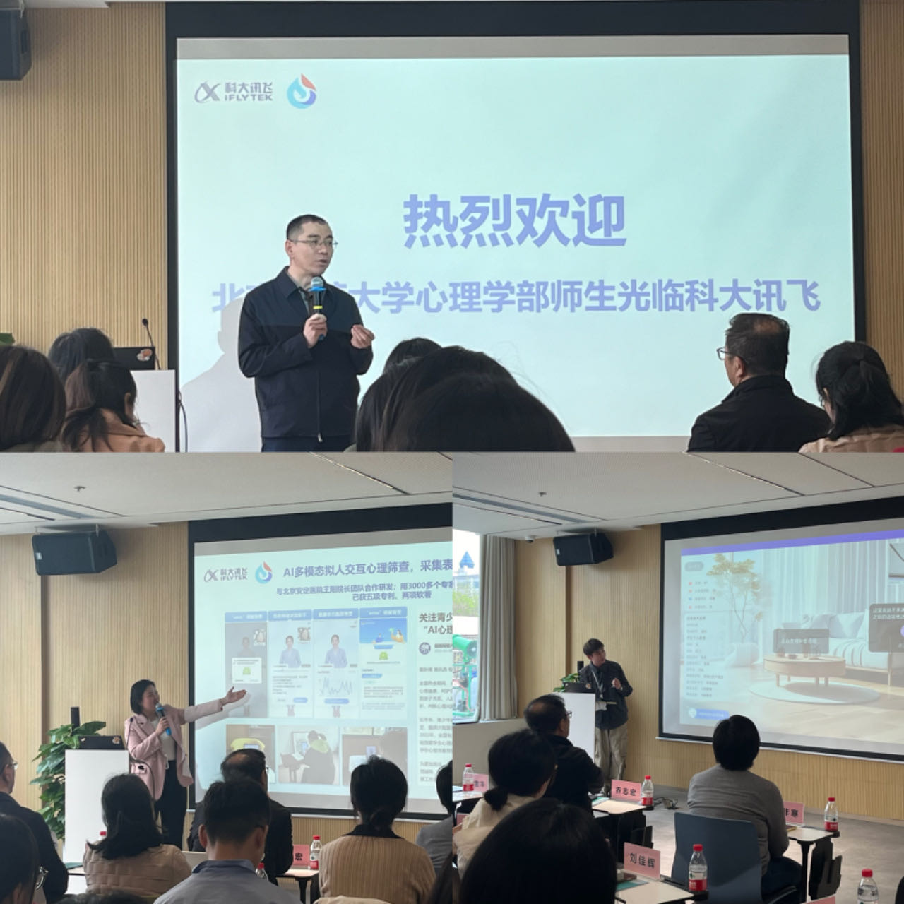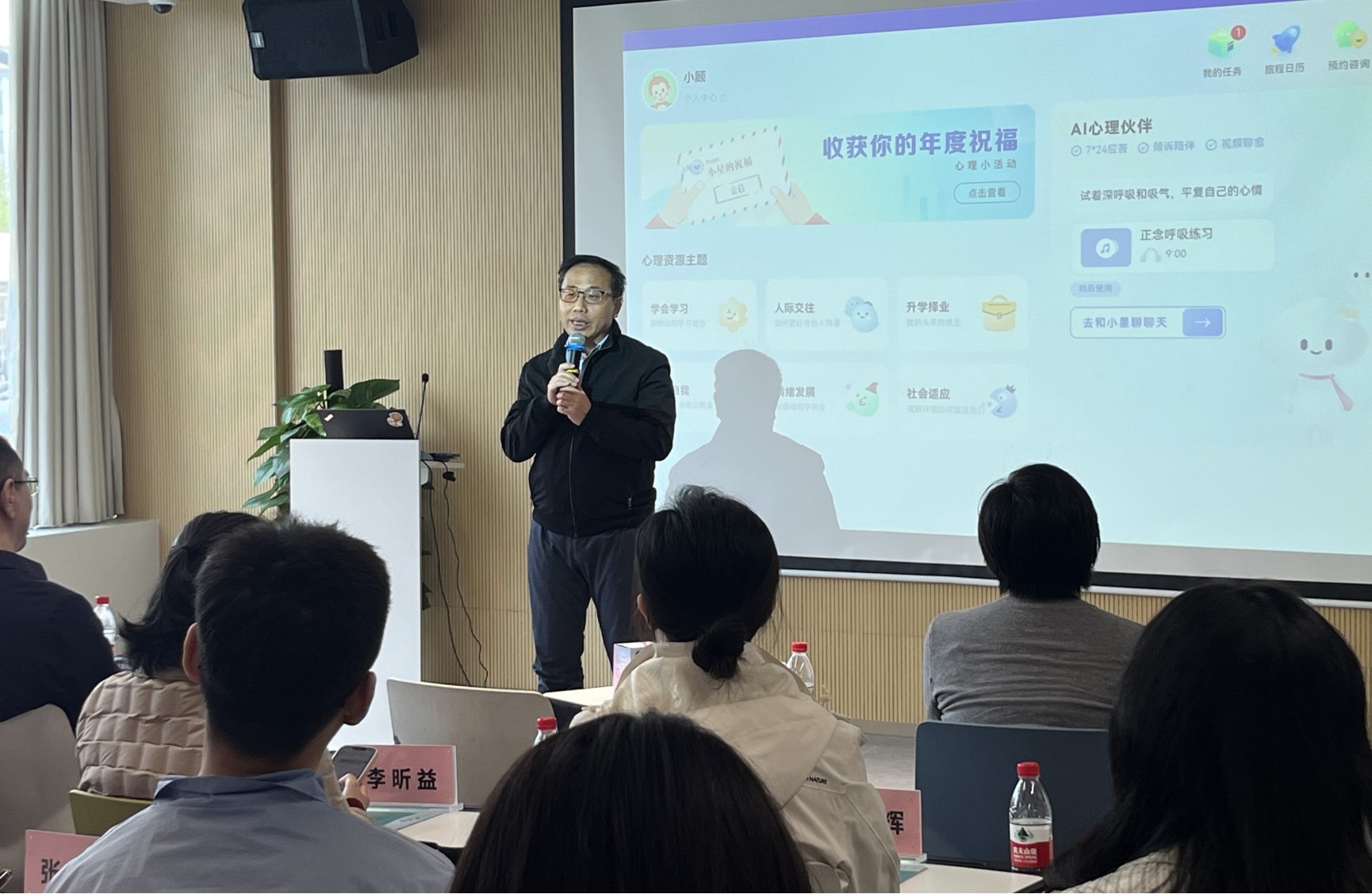 其次是座谈交流环节,科大讯飞教育BG副总裁郐吉丰致欢迎词,智慧心育产品线副总经理常雪亮作《星火大模型在青少年心理筛查及干预中的应用》专题报告,介绍了心理健康人工智能和大数据大模型结合的相关应用。教育智慧心育产品部总监李超群介绍了科大讯飞推出的心育产品——减压星球,带来AI心理伙伴产品功能演示,以及对学生能够起到什么样的作用。