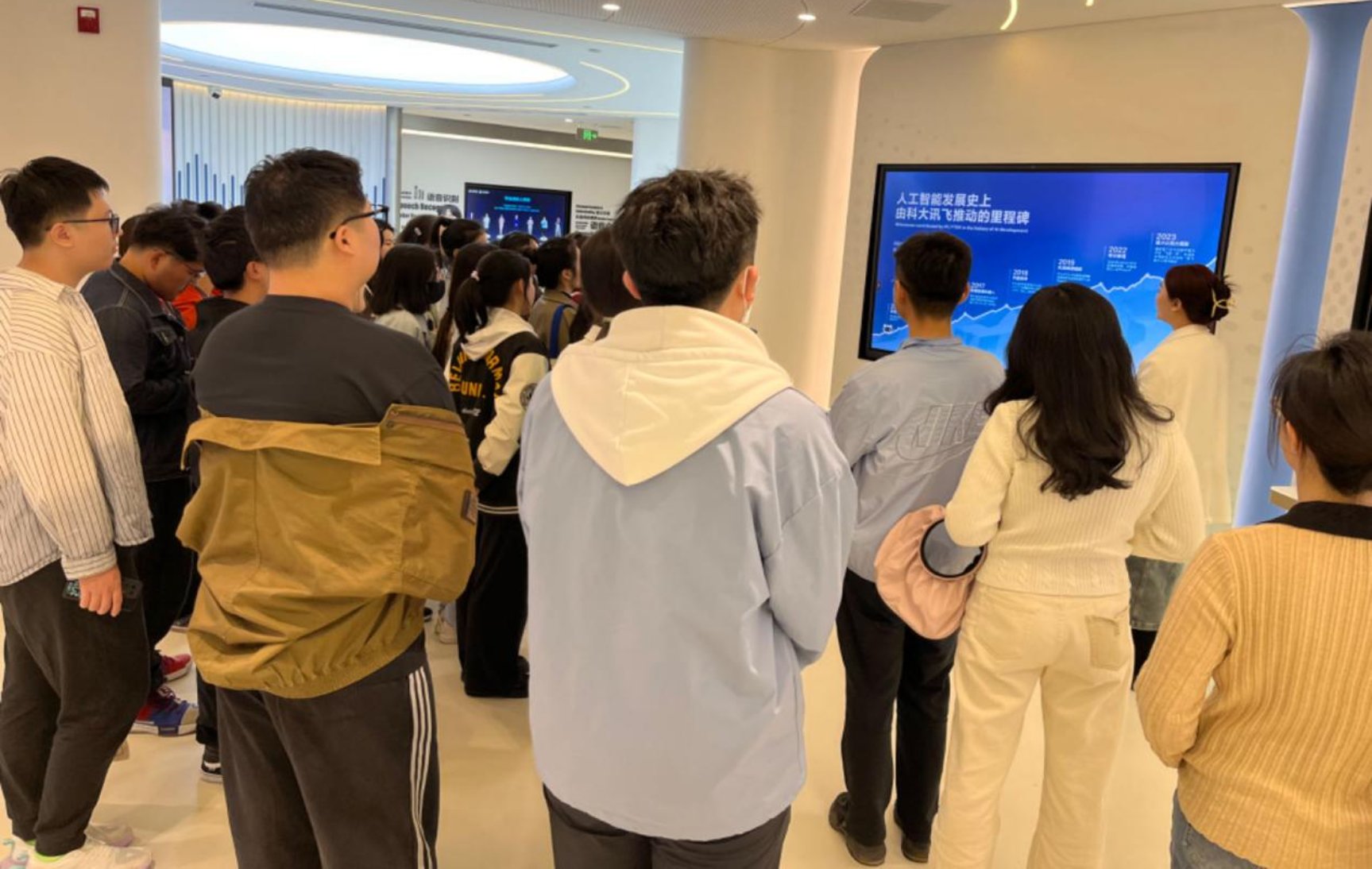 首先,参会人员一同参观了科大讯飞人工智能体验中心展厅,了解当前人工智能技术在教育、医疗、办公等领域的技术突破和规模化应用成果,并观摩体验了讯飞星火认知大模型。同学们重点参观学习了科大讯飞的产品在教育领域的应用。