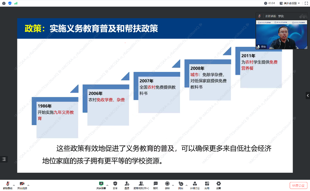 罗部长结合本课题组的元分析研究进行讲解,发现改革开放以来,中国基础教育学生的家庭社会经济地位与成绩的相关性逐渐降低,并介绍了改革开放以来中国政府为实现教育公平施行的一系列政策。罗老师也和同学们分享了研究带来的启示,中国的基础教育也给世界带来了“中国方案。