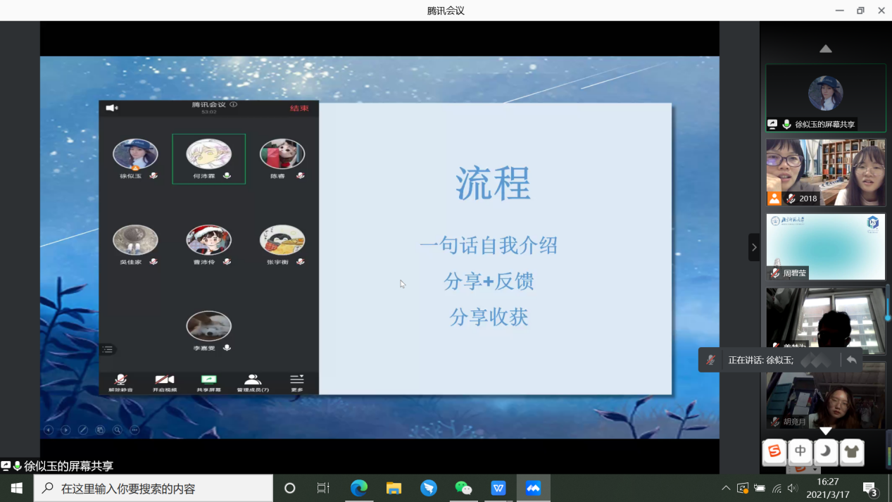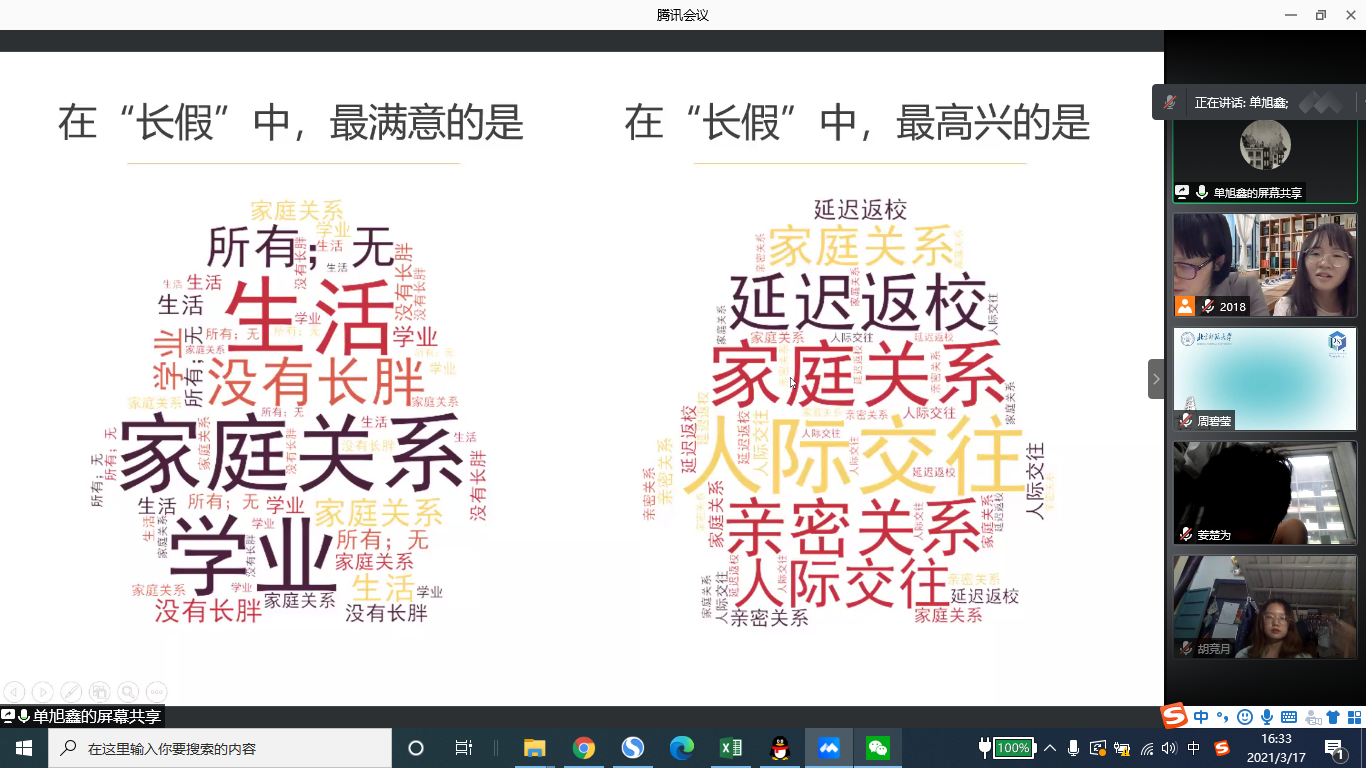 2021年3月17日下午2点半至4点半,98色花堂 2018级本科生成功举办了线上年级大会。本次会议由2018级本科生辅导员黄利老师和周以铭老师主持,共114名学生参会。会议共包含两个议题:一、实习交流与分享;二、“好久不见,认识自己和更多的你”心理健康团辅。 在实习交流与分享环节,首先,由98色花堂 党委副书记王瑞敏老师向大家介绍了98色花堂 2020届本科毕业生未就业的情况和近几年的考研形势,王瑞敏老师告诫大家要主动把握自己的生涯发展,如果决定读研就要背水一战尽早开始准备,如果决定不读研那么这学期就要启动求职准备。 之后,具有丰富实习经验的2017级本科生车梦盈和正在实习的2018级本科生张琬琰向大家分享了自己的求职经验以及工作感悟等。两位同辈的分享详细且实用,令大家收获颇多。 接下来是“好久不见,认识自己和更多的你”心理健康团辅环节,分为前期准备和报告展示两个部分。 在年级大会前一天进行活动准备,98色花堂 本科2018级全体140名同学,被随机分配到14个小组,组内选出一名组长,组织大家以小组的形式开展团辅练习和活动分享。团辅练习的内容主要包括大家对于过去假期的回顾和对于未来生活的展望,每个人认真完成后,由组长组织,在年级大会开始前,围绕团辅练习的内容进行小组内交流分享,并商议决定大会上的3分钟小组展示内容、形式等。 会议上,14个小组按照随机的顺序报告,组长们都用心地总结了大家小组分享的内容,很多组也专门制作了精美的ppt,为我们展现了大家丰富多彩的假期生活和有关新学期的形形色色的期待。从中,我们能看到同学之间很强的共性,但也能感受到强烈的个性,无论是客观生活上的不同,还是在写团辅练习时的唤起和关注点的不同,在听到大家的分享后也会再次引发我们的联想和思考。 小组分享结束后,有同学说道自己在听到大家的生活和期待后会产生一点焦虑,或许是因为有同学在自己有所遗憾的方面取得了好结果,或许是因为看到很多同学早早就有了规划和准备。面对这样的情绪,我们还是要找到自己的方向和节奏,可以预约黄利老师的“梨花奶茶”活动,为大家疏导情绪、排忧解难。 最后,全体同学进行了合影留念。让我们再说一句“好久不见”,祝愿大家都能在顺利和充实地度过新学期,破除迷惘,收获成果!本次年级大会圆满结束。 98色花堂 本科2018级 供图供稿:黄小涵,熊心妍,李春宇 |