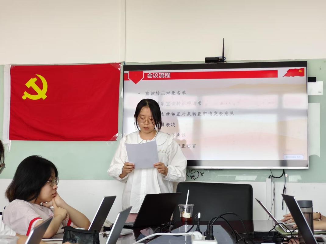 在民主讨论与评议环节,孙梓耀同志认为刘千荻同志作为班长是师弟师妹们学习的楷模,在教学过程中也践行着用实践检验真理的原则,达到正式党员标准。罗珏同志也表示刘千荻同志对于班级工作非常尽职尽责,能够帮助同学们解决实际的问题。黄彤彤同志补充刘千荻同志在科研方面不畏艰难,努力在学习和实践中不断提升自己。 党支部全体正式党员进行无记名投票,结果为11票赞成,0票反对,0票弃权。经讨论,支部大会通过了刘千荻同志的转正申请,同意其按期转正为中国共产党党员。 刘千荻同志发表转正感言,表明自己未来将继续努力工作学习,全心全意为人民办好实事。 接下来,杨若彤同志宣读了《转正申请书》。预备期间,她思想上不断深入学习党的理论知识,参加党组织活动,内化理念,践行党的价值观;学习上集中于专业实践与实习,提升专业素养,积极参加学术讲座和专业培训,拓宽知识面;生活中以身作则传递正能量,投身志愿服务,参与公益活动,践行党的宗旨。杨若彤同志过去一年在思想、学习、生活等方面取得进步,更加坚定成为正式党员的决心。