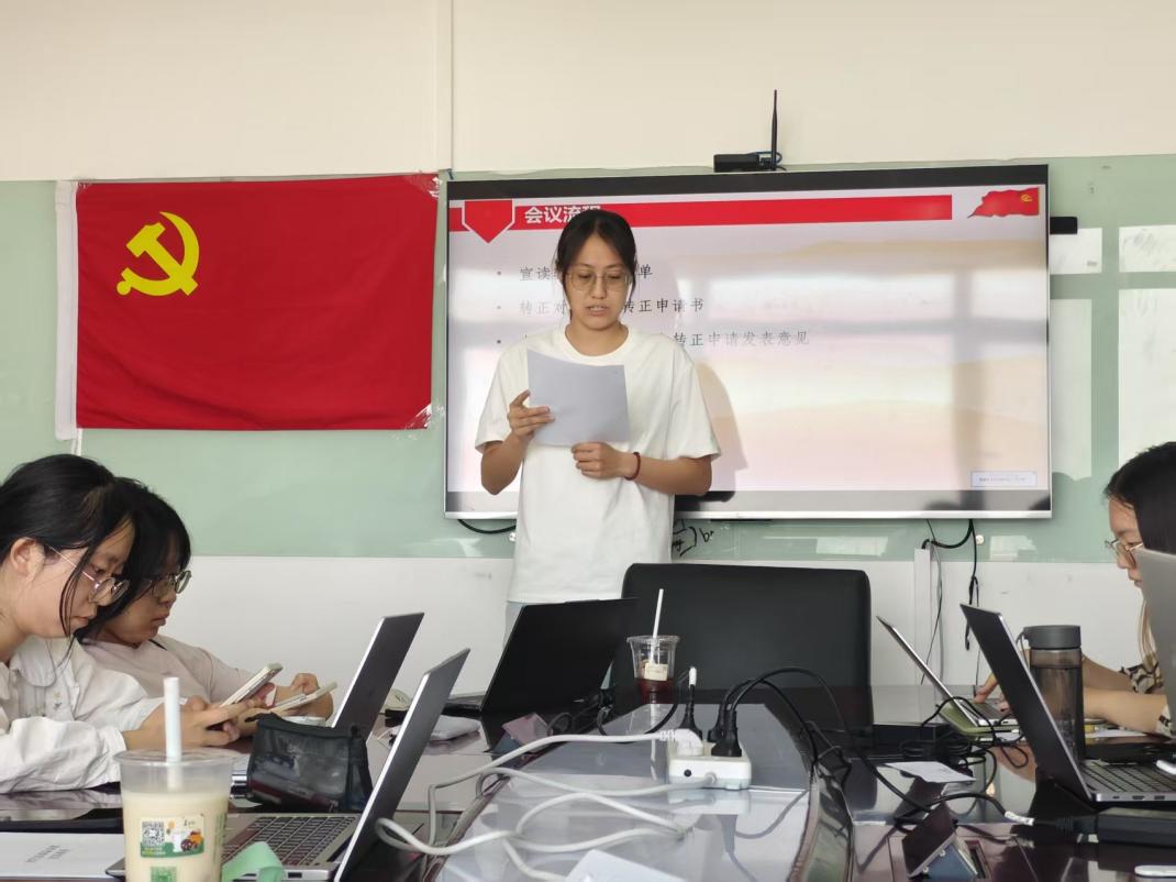 会议开始,全体成员起立,奏唱《国际歌》。随后,支部书记孙梓耀同志详细介绍了本次会议的流程及申请转正的预备党员顺序。 接下来,刘千荻同志宣读了《转正申请书》。她向党组织汇报了自己预备期的学习、思想、工作情况,在各方面均取得长足进步。思想上,刘千荻同志严格要求自己,积极参加各类学习活动,增强党性修养;学习上,她保持热情专注,成绩优异,积极参与实践活动和科研项目;工作上,她担任班长协助班主任工作,关心同学。