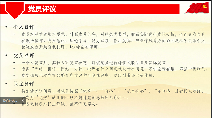 然后,通过之前对相关学习材料的学习,各位同志结合专业实际进一步学习党的二十大精神和总书记给我校重要回信精神,完成会前学习材料测试。 接下来,各位党员、预备党员同志对照党章规定要求,对照党员义务,对照先进典型,联系实际进行党性分析,全面查找自身在政治信仰、党员意识、理论学习、能力本领、作用发挥、纪律作风等方面的问题和不足,在会上积极地进行批评与自我批评。然后各位党员同志完成评议问卷,进行民主测评。