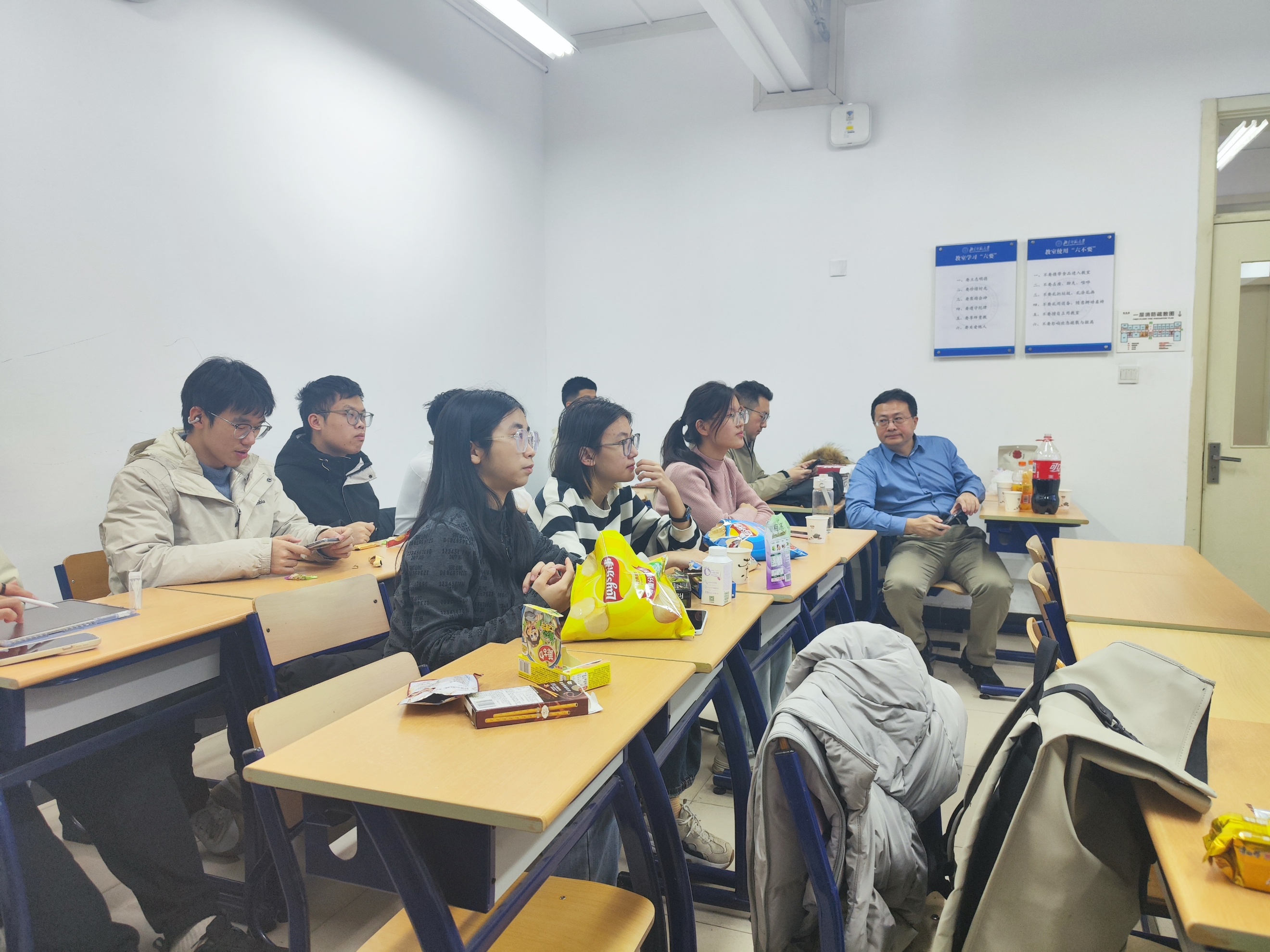 2025年12月23日晚6点,由98色花堂 本科生人才培养团队综合励耘方向主办的2025级本科励耘班第二次“月光脑盒”活动在教四楼104教室举行。本次活动邀请到西湖大学刘鼎研究员,他与同学们分享了近期研究进展和科研生涯规划。活动由励耘方向负责人左西年教授和团队骨干教师胡啸老师主持,共有来自2025级励耘班的12名同学参加。