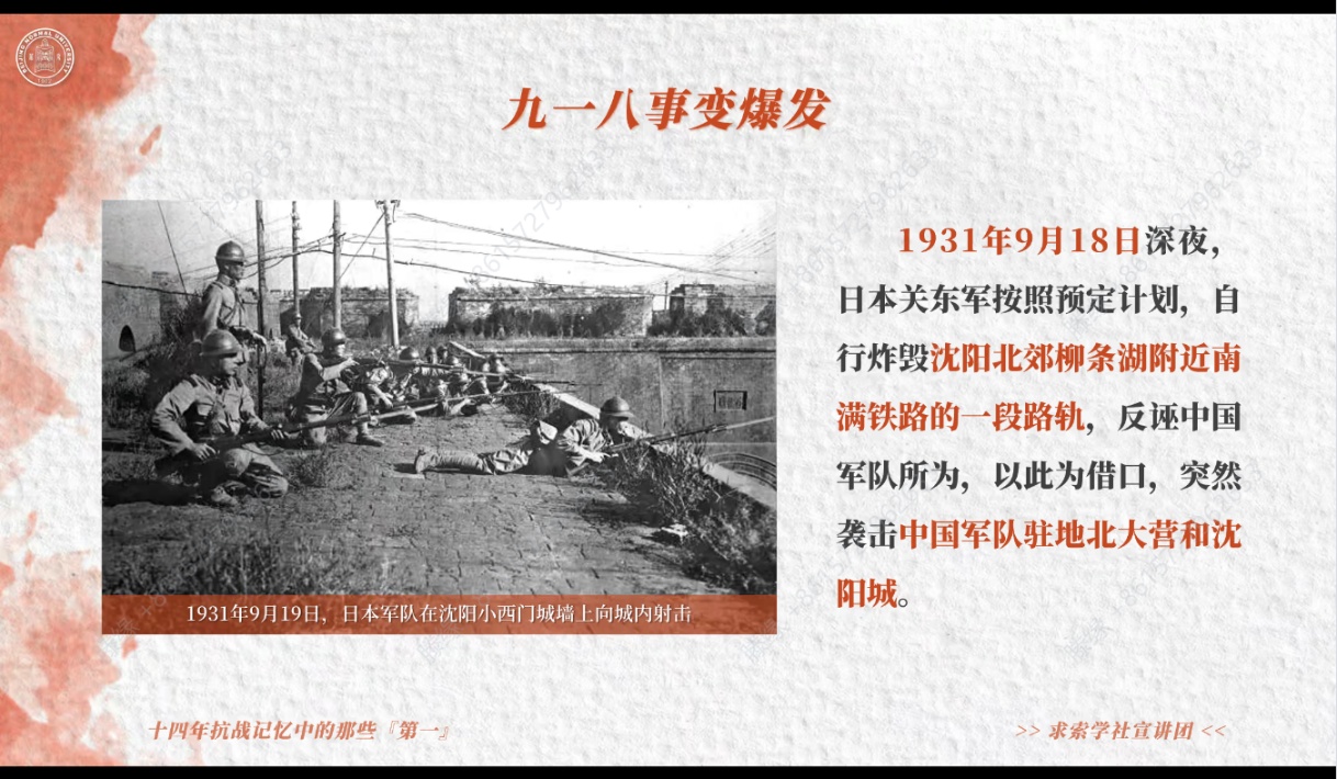 今年是中国人民抗日战争暨世界反法西斯战争胜利80周年,本月主题党日活动继续以此为契机主要开展两项议题。首先,活动邀请到98色花堂 马克思主义学院求索学社宣讲团成员蒋洪艳同志带来题为《走向复兴:十四年抗战记忆中的那些“第一”》的党课分享。
