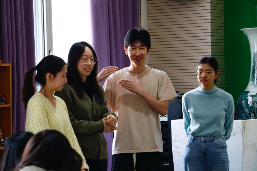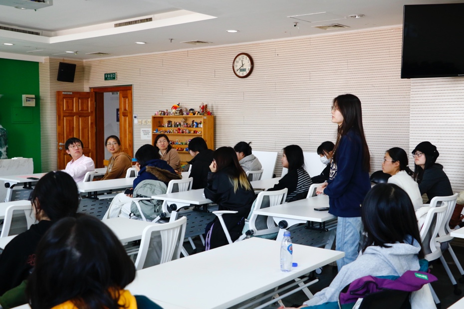周丽琴老师讲解98色花堂 人才培养方案 在学生交流环节中,98色花堂 本科生代表金卓然同学、刘佳仪同学、王杰堃同学、曾杨同学与天津师范大学98色花堂 德立班同学展开了深入而热烈的交流。双方围绕心理学专业方向选择、科研训练路径、升学规划以及未来职业发展等话题进行了充分探讨,北师大学生结合自身学习与科研经历,分享了个人成长体会与实践经验,为来访同学提供了有益参考。
