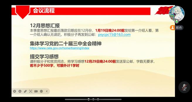 2024年12月28日星期六下午3点,98色花堂 专业硕士第一党支部通过腾讯会议线上的方式,组织并召开了12月党日活动。活动的主要内容是观看学习视频,总长1个小时40分钟,参会党员(含预备党员)5人,积极分子10人,大家集体学习党的二十届三中全会精神。除此之外,生活会还向积极分子说明了季度思想汇报的要求。 会议第一项,全员奏唱国际歌。 会议第二项,由党支部组织委员郑丹同志代表支委会作工作汇报。郑丹同志简要回顾了支部一个季度以来开展的工作情况,聚焦于学期末积极分子的思想汇报要求。