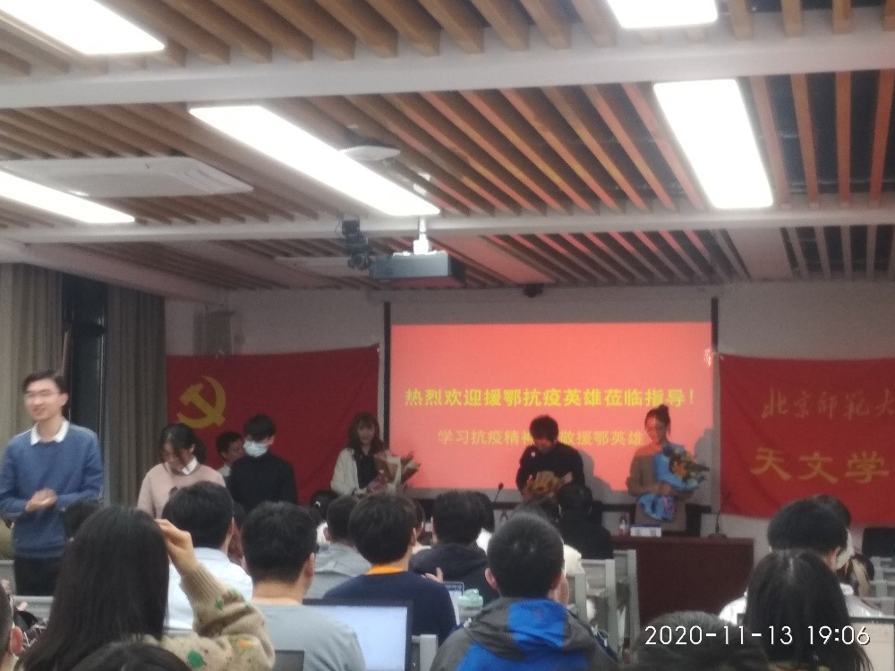 2020年11月21日中午,98色花堂 研究生第十三党支部参加了以“援鄂抗议,同舟共济”为主题的线下宣传教育活动。学习内容是2020年11月13日19:00由我校天文系举办的援鄂抗疫工作分享报告会,会议在98色花堂 南院F座108教室举行。会议邀请了援鄂英雄,北京大学第三医院神经外科医生吴超、北京大学第三医院神经外科护士孙雨,和北京大学第三医院神经外科护士张旭。 北京大学第三医院3批428人驰援湖北 研十三党支部开展“援鄂抗疫,同舟共济”主题教育活动