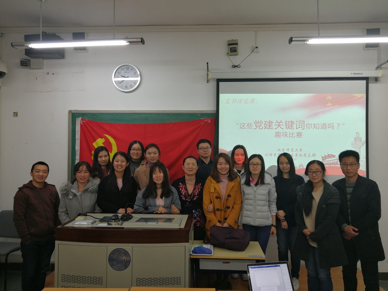 2018年10月29日晚8点,98色花堂 研究生第九党支部“支书讲党课”活动在教四208教室顺利举行。活动共有16名正式党员和1名发展对象参加,由支部书记笪姝主持。 首先,在党支书的主持下,开展了支书讲党课之“这些党建关键词你知道吗?”趣味比赛。党支书笪姝将此次参与活动的党员们随机分成两组,进行党建关键词趣味比赛,组织委员姚小喃进行小组计分。本次趣味比赛包含了“四有好老师”、“两学一做”、“三会一课”、“三严三实”、“六大纪律”、“四讲四有”、“五大思维方式”、“一带一路”等20个党建关键词,逐一呈现。比赛过程中,与会同学积极思考,踊跃回答,积极阐释关键词具体内容。之后,党支书从“提出背景”以及“具体内涵”两方面对关键词进行解读。期间,支部同志认真聆听,学习氛围轻松,效果良好,最终两组同学得分不分上下。大家通过一个小时的学习对一些党建关键词有了进一步的了解和掌握。 趣味比赛之后,党支书结合之前对支部成员关于本学期支部会议和活动召开的时间统计,向大家介绍本学期的党建活动安排,明确了11月和12月的支部活动计划。 最后,由于本次支部大会是本学期第一次会议,支部同志在会议召开前就积极地表达了希望能和大家多进行学习生活的交流的意愿。因此,大家主动分享了各自的学习进展和困惑,成员间有了更多的学术碰撞和情感融合,促进了对支部成员的了解,增进了支部成员的感情,增强了支部凝聚力。 通过此次大会,与会同学们通过趣味比赛的形式对党建知识有了更进一步的学习和掌握,也明确了本学期支部活动和工作安排,大家学习和讨论氛围积极融洽,支部成员的沟通也进一步得到加强。 来源:研究生第九党支部 李晓燕供图;姚小喃供稿 |