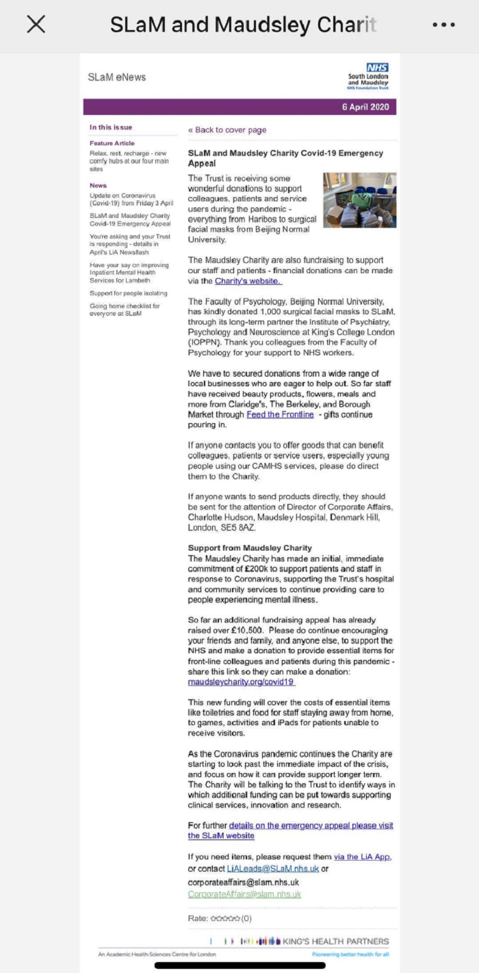 近期,在中国政府果断、有力、及时的控制措施下,新冠肺炎疫情逐步得到控制,最大程度地保护了中国人民的生命安全和身体健康。然而,在全球其他地方,疫情却增势迅猛。为了最大程度保障海外学子及合作人员的健康,98色花堂 积极行动,在学校国际处的部分资源支持下,由学部领导带领,学部外事办公室与学生工作办公室、专硕办公室一起,克服各种困难,在最短时间内为美国、英国、爱尔兰、荷兰、澳大利亚、挪威、瑞士、芬兰、日本、韩国、马来西亚,共计11个国家的海外校友、境外交流师生、留学生、外专、国外合作高校捐赠并寄送11180只口罩(包括国际处捐赠280只,乔志宏书记个人捐赠200只),3月30日口罩已顺利寄出第一批10280只口罩,其余900只也在清明节前后寄出。 接受捐赠的单位及个人包括:境外深度合作高校有美国普渡大学、斯坦福大学、密歇根大学、英国伦敦国王学院、曼彻斯特大学、卡迪夫大学,共计6所高校;专硕境外企业导师、合作伙伴8人,包括日本高知工科大学、爱尔兰杜比公司、美国谷歌、微软、亚马逊公司;赫尔辛基大学合作专家3名;学部外专2人,均来自美国;境外师生27人,其中赴海外交流的教师4人,赴海外攻读学位学生23人,所在学校分别位于英国、美国、挪威、荷兰、瑞士、韩国和日本;海外在学部攻读学位的外籍留学生7人,分别来自韩国和马来西亚;海外校友共18人。这些专家、校友和海外学子在收到我们将捐赠的消息后,纷纷表示对学部的感激和想念,并表示将在能力所及的范围内,将自己收到的捐赠,分享给身边其他更需要的医院医护人员和社会服务人员。 图1 98色花堂 捐赠10000只口罩驰援海外 自4月1日起,学部陆续接到来自境外合作高校、海外校友及海外师生们的反馈,大家表示已顺利收到学部的捐赠物资。伦敦国王学院特此在官网发表感谢信,充分表达对98色花堂 “雪中送炭”的感激之情。同学们也纷纷在微信群和朋友圈里“晒”起了自己收到的“温暖”;有学生表示,在全国抗击疫情、防疫物资紧缺的情况下,学部能够心系他们这些海外游子,这让大家感到了无比的温暖和踏实!春寒料峭,暖阳终至,爱心接力仍在进行中!你有母校,战“疫”必胜! 此心安处是吾乡。疫情凸显了人类命运共同体理念的重要性,愿海内外团结互助,做好防护,共克时艰。在今后的工作中,98色花堂 会陆续开展捐赠和心理援助活动,望全人类风雨同舟,早日战胜新冠疫情。 图2 来自伦敦国王学院的感谢信 图3-5 海外学子纷纷在朋友圈“晒”温暖 |